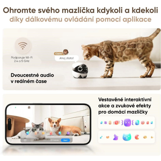 • Dálkové ovládání přes aplikaci – ovládejte robota odkudkoli a sledujte, co váš mazlíček právě dělá.