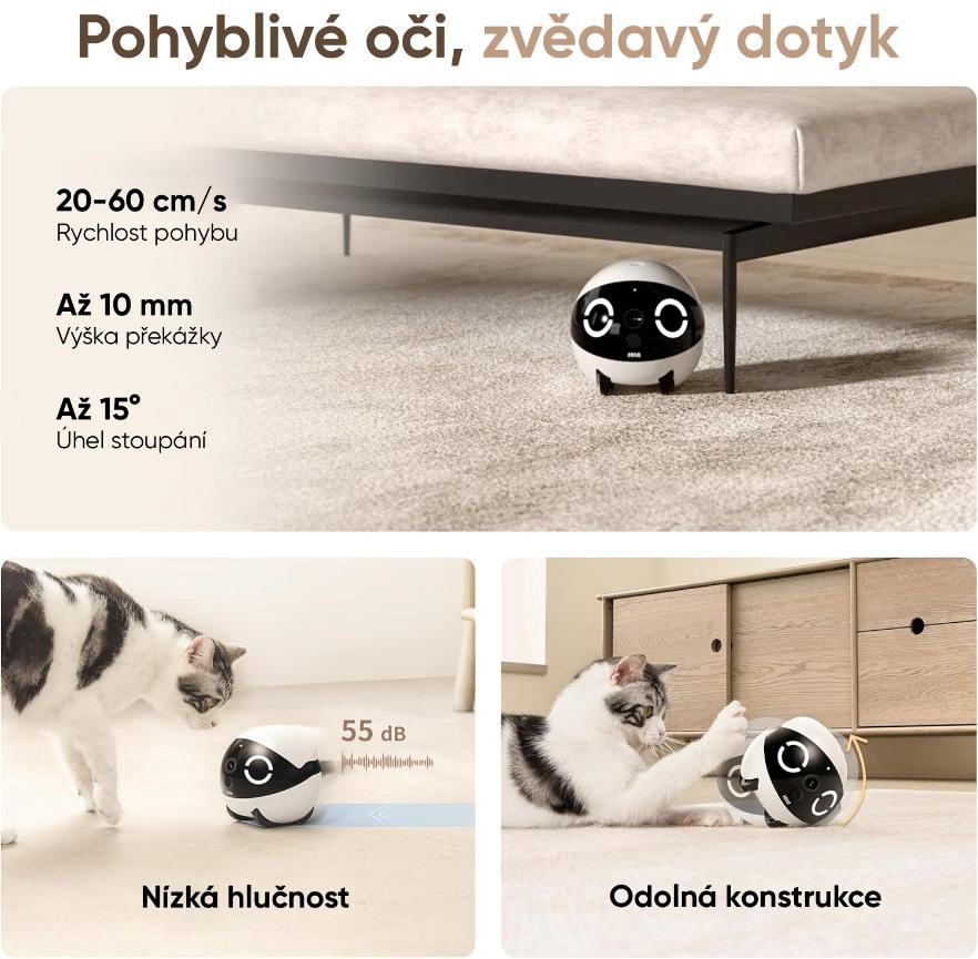 • Dálkové ovládání přes aplikaci – ovládejte robota odkudkoli a sledujte, co váš mazlíček právě dělá.