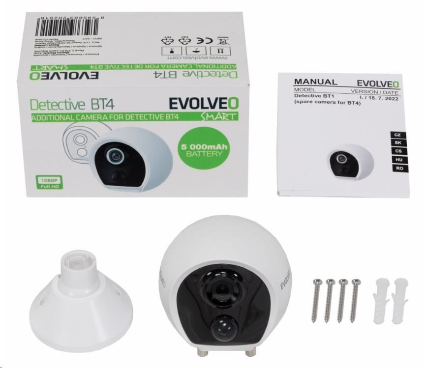 Náhradní kamera určená pro rozšíření instalace EVOLVEO Detective BT4. Kamera je vybavená akumulátorem s 5000mAh kapacitou. Pod krytkou se nachází USB-C konektor pro nabíjení a tlačítko pro zapnutí/vypnutí a párovací režim. Kamera je vybavená nočním IR přísvitem a PIR čidlem pro rozeznání pohybu. Součástí kamery je i mikrofon a reproduktor pro obousměrnou hlasovou komunikaci.