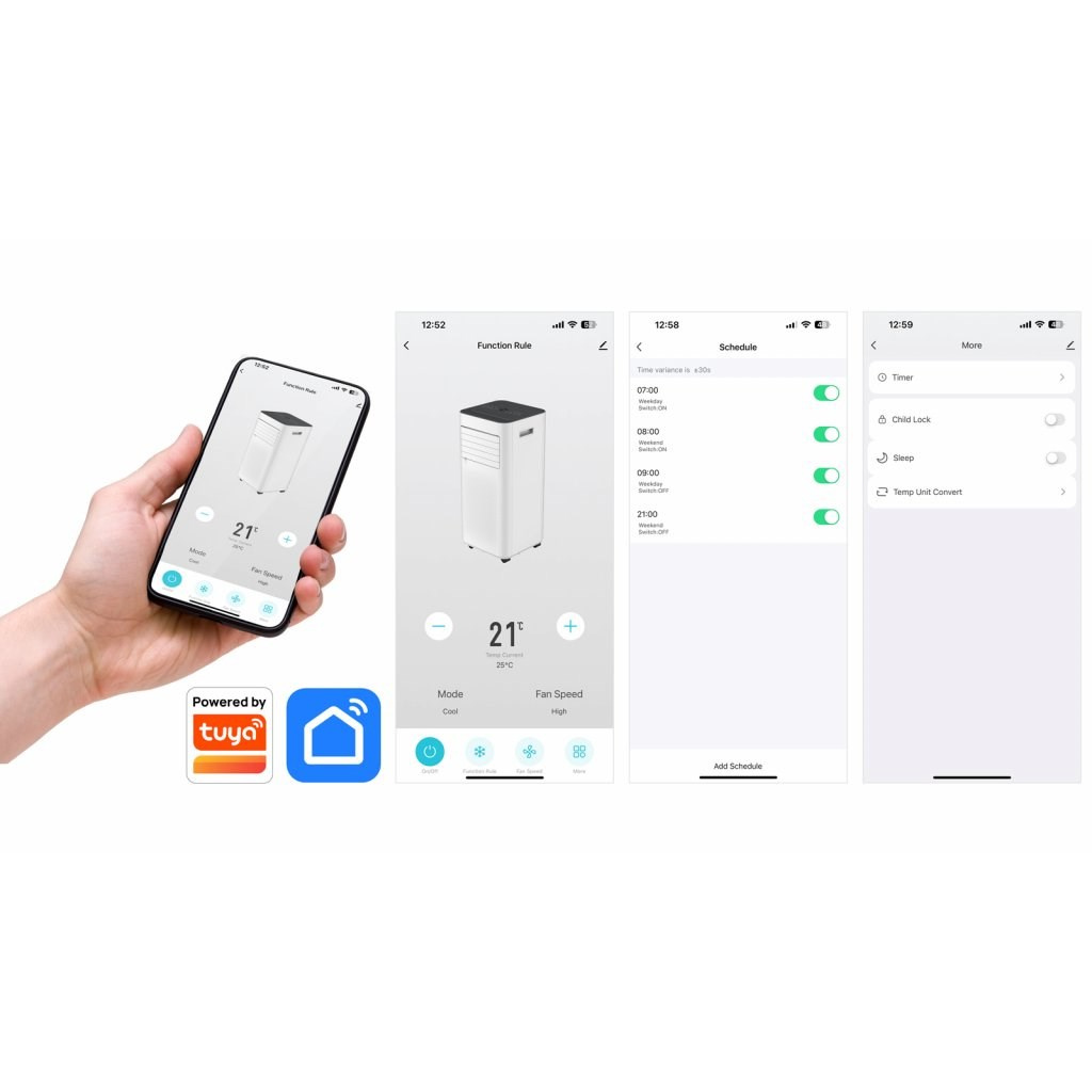 Klimatizaci je možné propojit s mobilním telefonem díky bezplatné aplikaci Tuya SmartLife, která je ke stažení jak pro mobilní telefony iPhone, tak pro všechny mobilní telefony se systémem Android. Vybrat si můžete ze dvou způsobů připojení – WiFi nebo Bluetooth. Mobilní aplikace nabízí tyto možnosti ovládání a přehledů:
