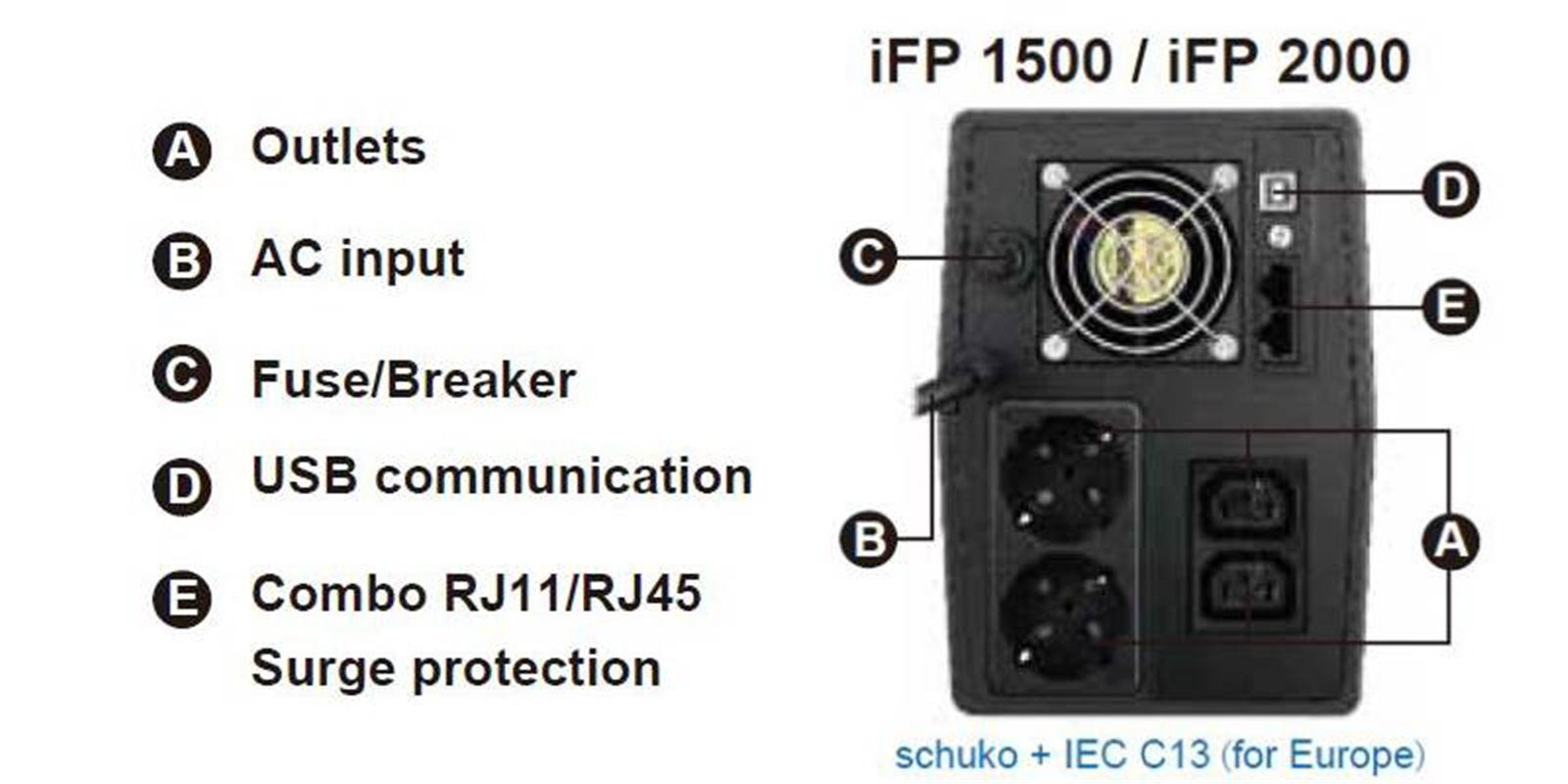 Typ výstupních zásuvek: 2 x Schuko zásuvka + IEC C13