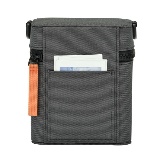 Fujifilm při návrhu věnoval pozornost každému detailu – černo-šedé barevné provedení doplňuje výrazné oranžové poutko zipu, které ladí s akcenty přímo na těle fotoaparátu. Výsledkem je harmonický, promyšlený celek, který působí moderně a jednotně.