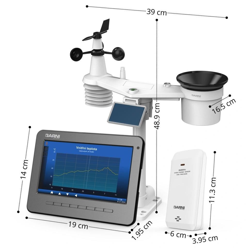 Poloprofesionální Wi-Fi meteorologická stanice model GARNI 3015 Arcus s integrovaným bezdrátovým čidlem 7-v-1 se solárním panelem a vestavěným kapacitorem a přídavným bezdrátovým čidlem GARNI 055H, která je vybavena mnoha funkcemi shromažďuje přesné a podrobné údaje o počasí. Integrované bezdrátové čidlo pracuje na frekvenci 868 MHz a měří teplotu a relativní vlhkost, rychlost a směr větru, dešťové srážky, barometrický tlak, UV index a intenzitu slunečního záření. Výrobek používá vysoce přesná švýcarská čidla SENSIRION a umožňuje kalibraci některých meteorologických veličin.