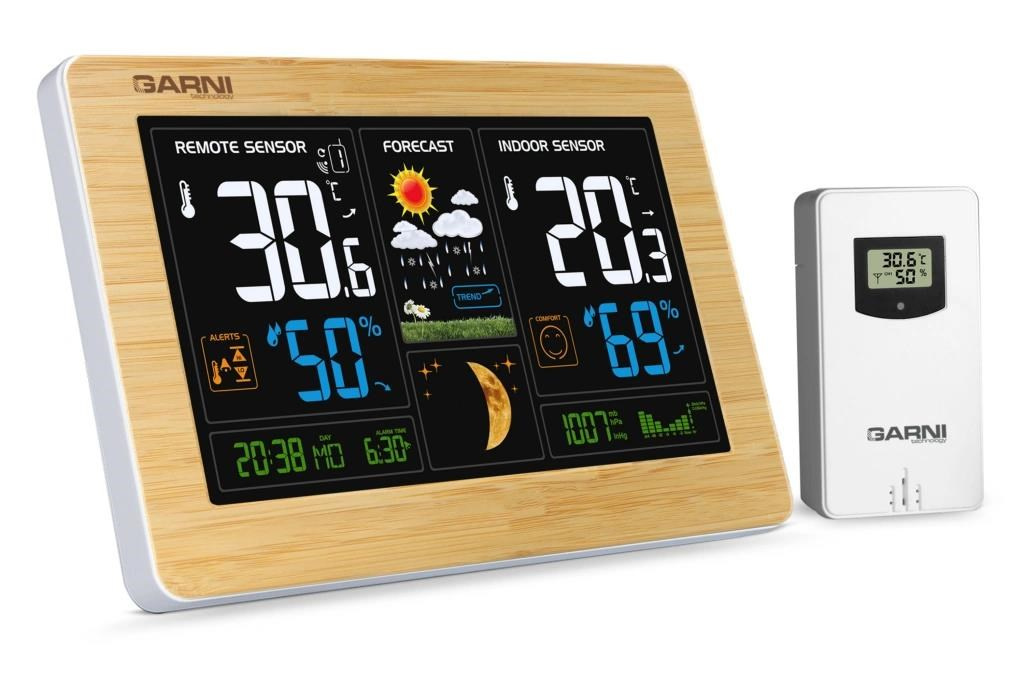 ? inverzní barevný VA displej o rozměrech 167 x 93 mm s možností stálého osvětlení při napájení síťovým adaptérem, nebo krátkodobým osvětlením na 15 s při napájení bateriemi ? ? velikost číslic na displeji – čas, datum, barometrický tlak 8 mm, zkratka názvu dne 6 mm, vnitřní a vnější teplota 30 mm, vnitřní a vnější relativní vlhkost 20 mm ? čas a datum řízené signálem DCF-77 s možností manuálního nastavení ? ikona příjmu signálu DCF-77 ? zkratka názvu dne ? 12ti, nebo 24 hodinový formát zobrazení času ? možnost nastavení časového pásma od -12 do +12 hodin ? ? budící signál - 10 sekund 1 pípnutí za sekundu, 10 sekund 2 pípnutí za sekundu, 10 sekund 4 pípnutí za sekundu a poté stále 8 pípnutí za sekundu ? 6 animovaných ikon předpovědi počasí (slunečno, polojasno, oblačno, srážky, silný déšť a sněžení) na základě sledování barometrického tlaku vestavěným barometrickým čidlem ? ? ? měření absolutního barometrického tlaku (mb / hPa nebo inHg) ? šipky tendence vývoje absolutního barometrického tlaku, vnitřní a vnější teploty a rel. vlhkosti ? ? zobrazení teploty ve C, nebo F ? možnost použití až 3 bezdrátových čidel GARNI 30H (jedno čidlo GARNI 030H je součástí dodávky) ? funkce automatického přepínání kanálů ? 5 ikon vnitřní tepelné pohody ? bezdrátový přenos hodnot vnější teploty a relativní vlhkosti na frekvenci 433 MHz ? ikona příjmu signálu bezdrátového čidla ? zobrazení fáze Měsíce ? USB port pro nabíjení mobilních zařízení (pouze při napájení hlavní jednotky síťovým adaptérem), maximální nabíjecí proud 1 000 mA ? ikony slabých baterií ? napájení síťovým adaptérem nebo bateriemi ? možnost postavení, nebo zavěšení ? barva bílá, přední rámeček z bambusového dřeva Bezdrátové čidlo GARNI 030H ? vlhkosti odolné ? displej o rozměrech 19 x 11 mm ? velikost číslic na displeji: teplota a relativní vlhkost 4 mm ? měření teploty a relativní vlhkosti ? 3 kanály ? maximální RF výkon 10 dBm (10 mW) ? možnost postavení a zavěšení ? barva bílá Obsah balení: 1 x hlavní jednotka GARNI 547 Line 1 x bezdrátové čidlo GARNI 030H 1 x síťový adaptér český, slovenský, německý, anglický, nizozemský, polský a maďarský návod.