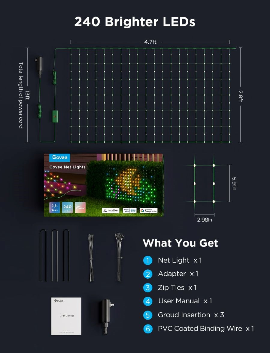 Govee síťě jsou navrženy tak, aby odolávaly nepříznivým povětrnostním podmínkám, a jejich vodotěsná konstrukce s certifikací IP65 zajišťuje, že si zachovají svůj výkon i při dešti nebo sněhu. Instalace je snadná a rychlá, což vám umožní ihned začít vytvářet kouzelnou atmosféru, ať už je to na zahradě, v altánu nebo při venkovních akcích. S chytrou světelnou sítí od Govee získáte dokonalý doplněk pro jakoukoli sezónu a příležitost, který přetvoří váš prostor na místo plné světla a atmosféry.
