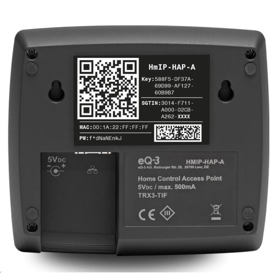 Centrální jednotka (HmIP-HAP-A) je připojena ke standardnímu routeru ethernetovým kabelem (RJ-45) a slouží jako rozhraní mezi cloudem Homematic IP umístěným výhradně na serverech v Německu a zařízeními Homematic IP ve vaší domácnosti.