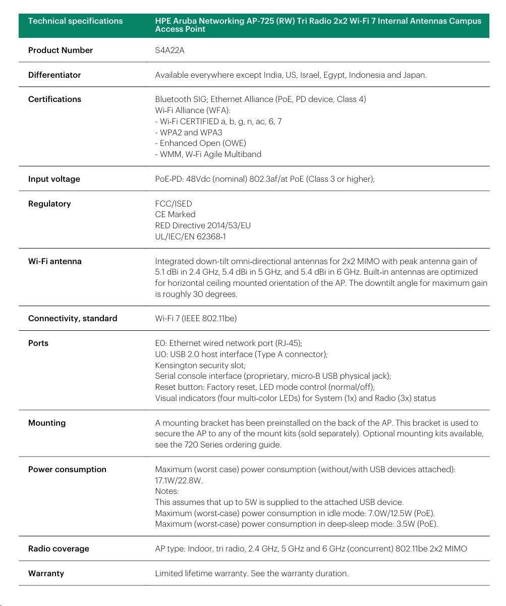 HPE Aruba Networking AP-725: Technical Specifications