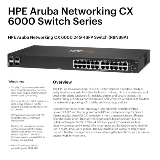 The HPE Aruba Networking CX 6000 Switch Series is a modern family of entry-level access switches ideal for branch offices, midsize businesses, and small enterprises. Optimized for reliable, simple, and secure access, the CX 6000 Switch series provides a convenient and cost-effective wired access solution for networks supporting IoT, mobile, and cloud applications.