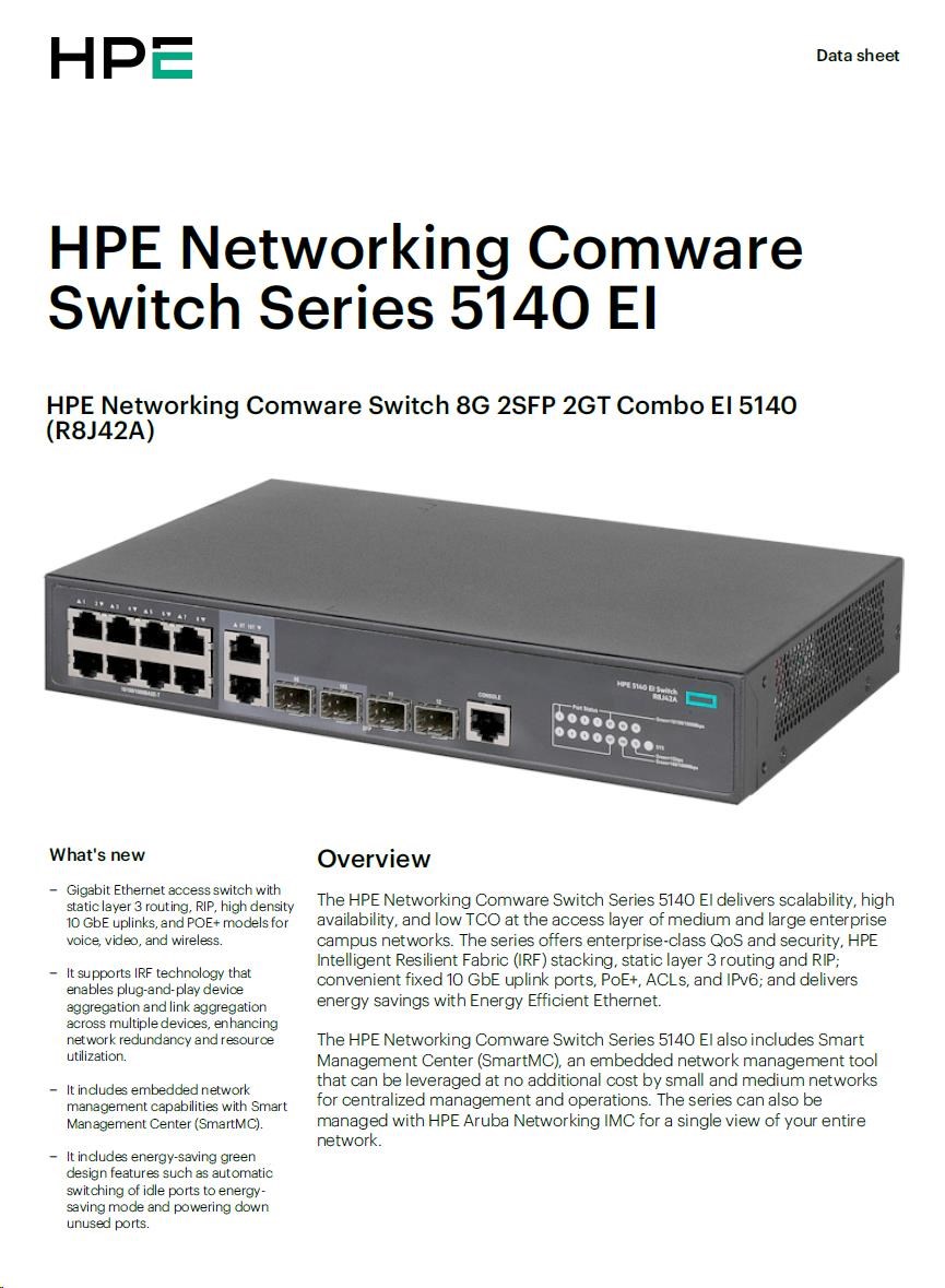 HPE Networking Comware Switch 8G 2SFP 2GT Combo EI 5140 R8J42AR RENEW