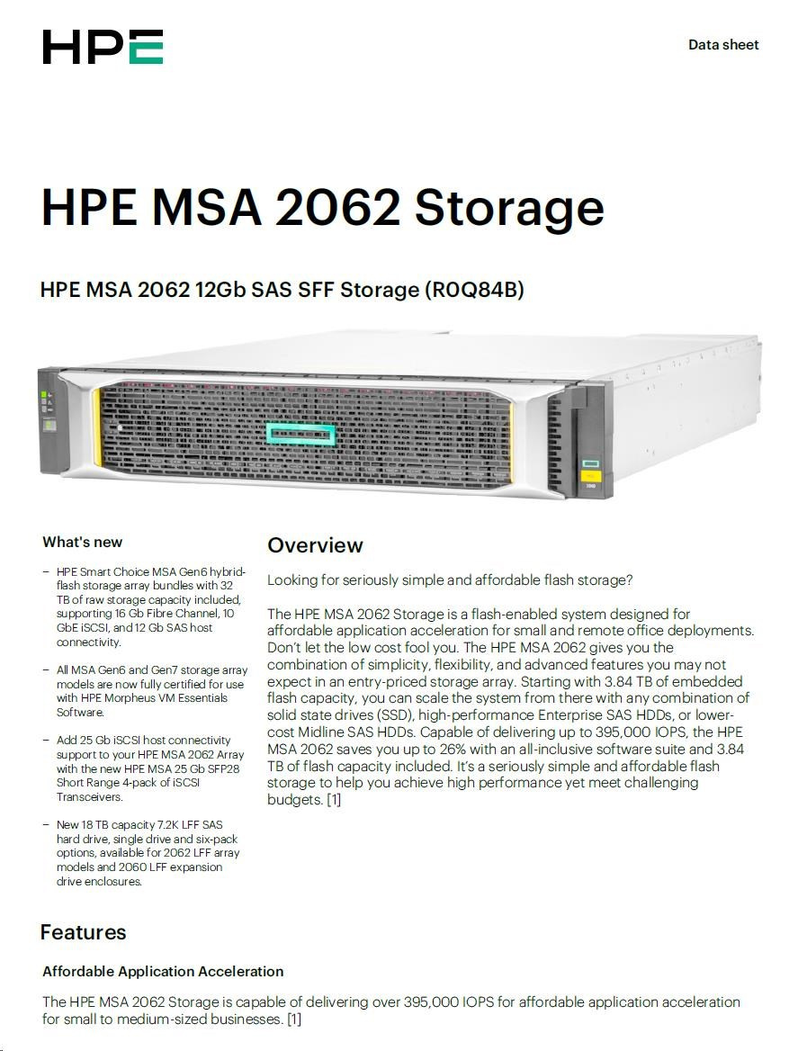 HPE MSA 2062 12Gb SAS SFF Storage Includes an MSA 2060-branded LFF or SFF array chassis depending on model, two MSA 2060 controllers, two 1.92TB Read Intensive SSDs, One Advanced Data Services LTU, two AC power supplies, two .7m PDU cords (IEC C14), one rack-mount kit..