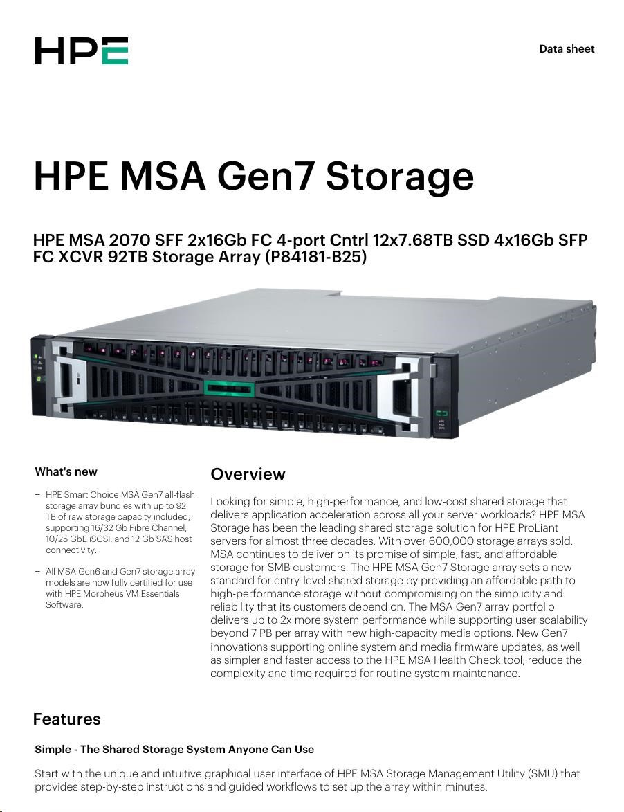 HPE MSA 2070 SFF 2x16Gb FC 4-port Controller 12x7.68TB SSD 4x16Gb SFP FC XCVR 92TB Storage Array Smart Choice.