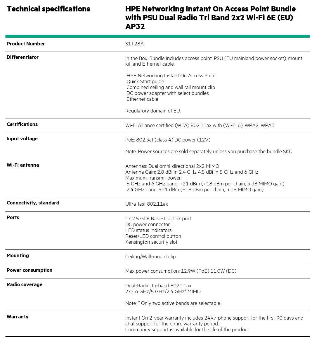 HPE Networking Instant On Access Point Bundle with PSU Dual Radio Tri Band 2x2 Wi-Fi 6E (EU) AP32 ( S1T28A )