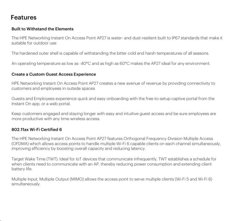 Take your business outdoors with the HPE Networking Instant On Access Points AP27. This fast outdoor Wi-Fi 6 AP is IP67 rated, keeping you connected through hot summers, frigid winters, rain, sleet, and snow. Able to withstand temperatures from temperatures from -40°F to 149°F, you can confidently connect up to 75 devices over Wi-Fi 6 to extend coverage to parking lots, outdoor workspaces, and hotel pools.