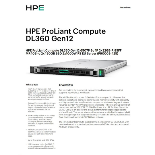 | Model Name | HPE ProLiant Compute DL360 Gen12 6507P 8c 1P 2x32GB-R 8SFF MR408i-o 2x480GB SSD 2x1000W PS EU Server |