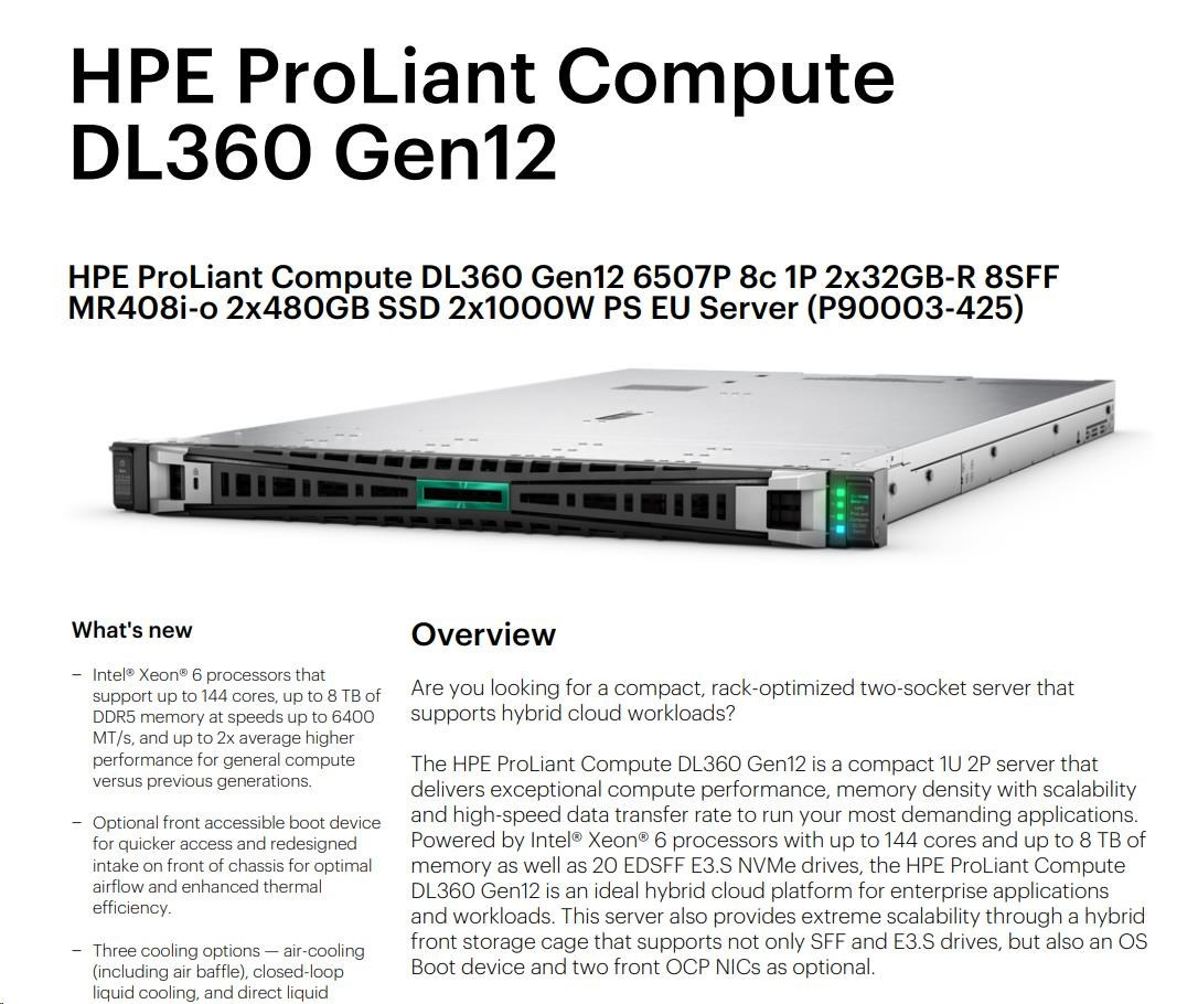| Model Name | HPE ProLiant Compute DL360 Gen12 6507P 8c 1P 2x32GB-R 8SFF MR408i-o 2x480GB SSD 2x1000W PS EU Server |