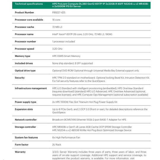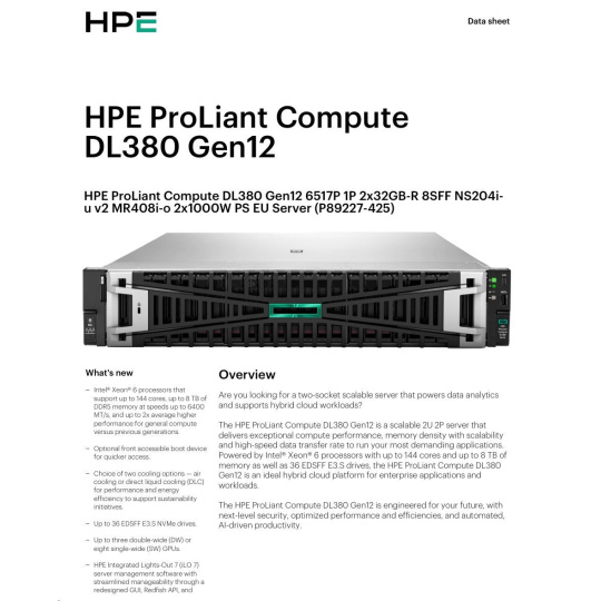 HPE PL DL380 Gen12 6517P (3.2/16C) 2x32G (P69727) NS204(2x480) MR408i-o 8SFF 2x1000W 10GbE NBD333 Smart Choice