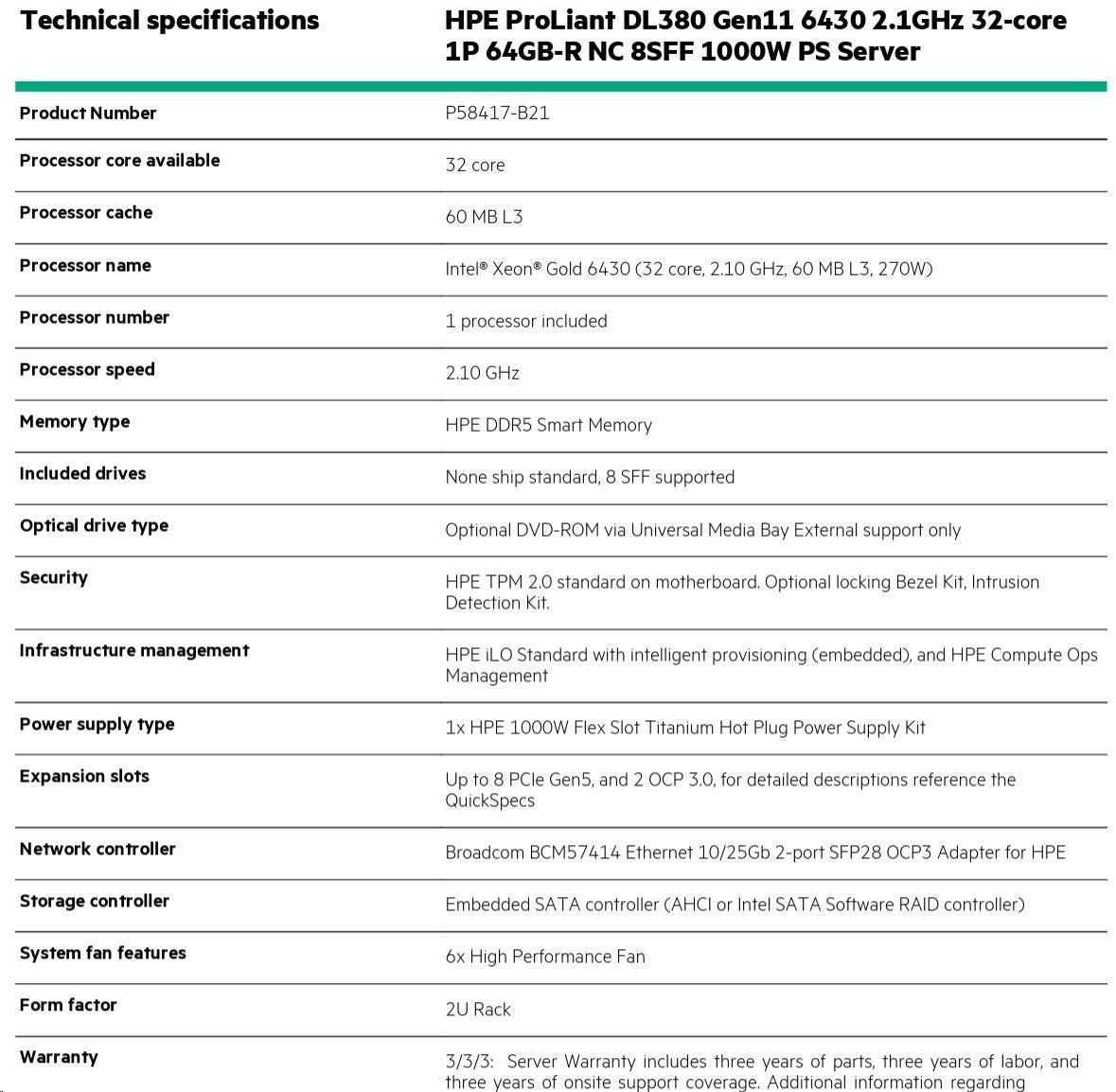 Model Name HPE ProLiant DL380 Gen11 6430 2.1GHz 32-core 1P 32GB-R NC 8SFF 1000W PS Server