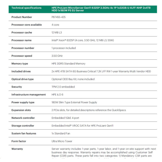 HPE PL MicroServer Gen11 6325P (3.5/4C) 1x32G 2x4TB SATA 4LFF/SFF-NHP VROC 4p1G iLoPort (P65741) NBD111 Smart Choice
