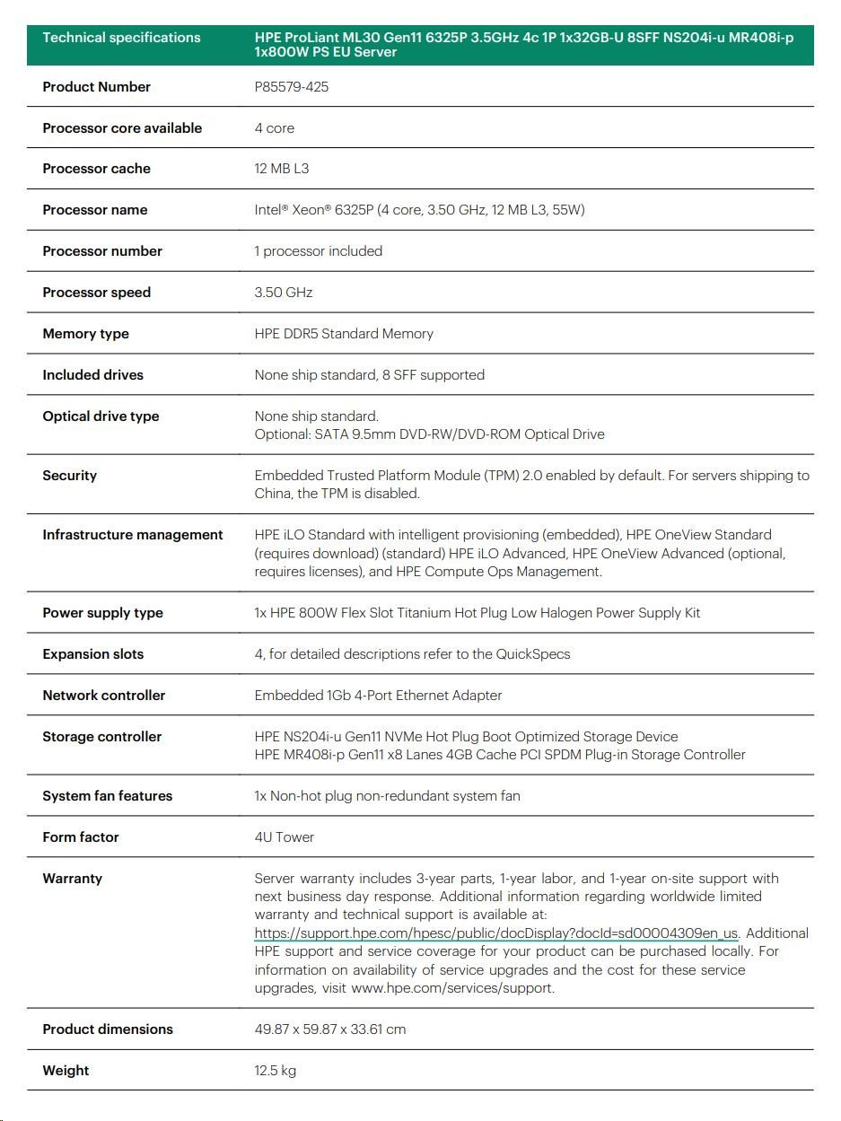 HPE PL ML30g11 6325P (3.5G/4C8T) 1x32G 8SFF NS204i-u(2x480g) MR408i-p/4G 2x800W 3/1/1 Smart Choice.
