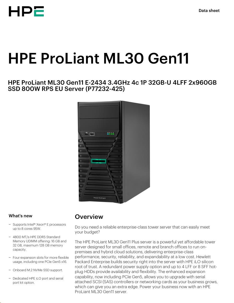 | Model Name | HPE ProLiant ML30 Gen11 E-2434 3.4GHz 4c 1P 32GB-U 4LFF 2x960GB SSD 800W RPS EU Server |
