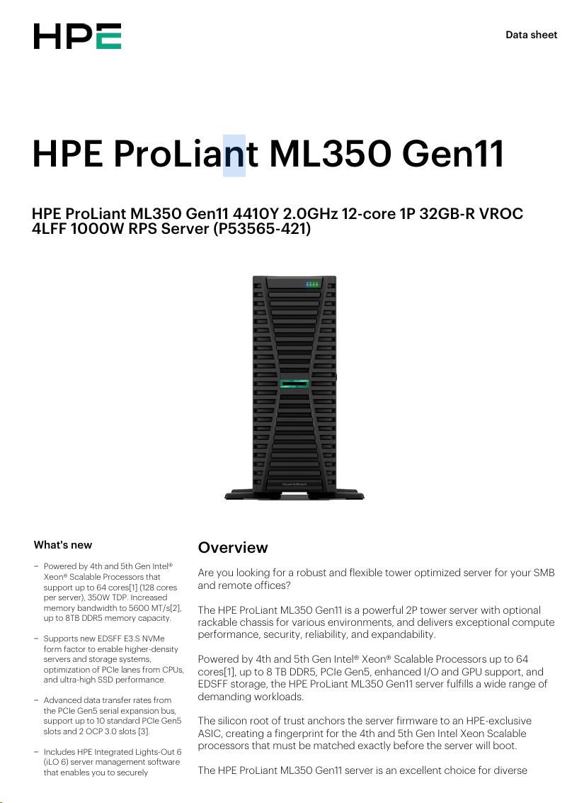 Model Name HPE ProLiant ML350 Gen11 4410Y 2.0GHz 12-core 1P 32GB-R VROC 4LFF 1000W RPS Server