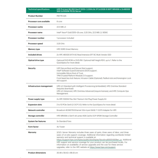 HPE PL ML350g11 5515+ (3.2G/8C) 2x32G (P64706) 8-24SFF MR408i-o/4G 2x480G SSD 2x1000W 4x1G Smart Choice.