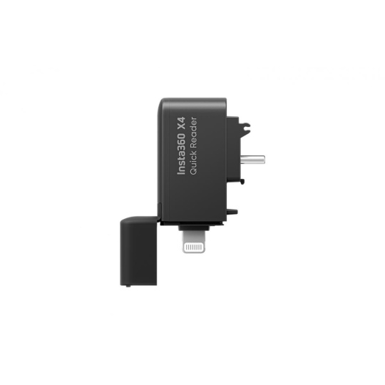 Rychlá čtečka karet pro kameru Insta360 X4. Čtečka slouží k rychlému stažení souborů z karty v kameře Insta360 X4 a následnému nahrání souborů do telefonu. Konektor Lightning/USB-C. Váha: 12,5g Rozměry: 46 x 14 x 31 mm.