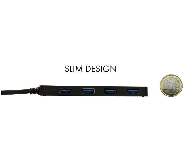 Tento HUB nabízí čtyři USB 3.0 porty s funkcí Plug & Play a standardním USB nabíjením – HUB automaticky detekuje, jestli je připojeno zařízení pro USB nabíjení. Rozhraní USB 3.0 je důležité zejména pro datové přenosy z USB 3.0 paměťových karet a flash disků, kde se nejvíce využije jeho vysoká přenosová rychlost. LED dioda zobrazuje stav čtení a zápisu dat.