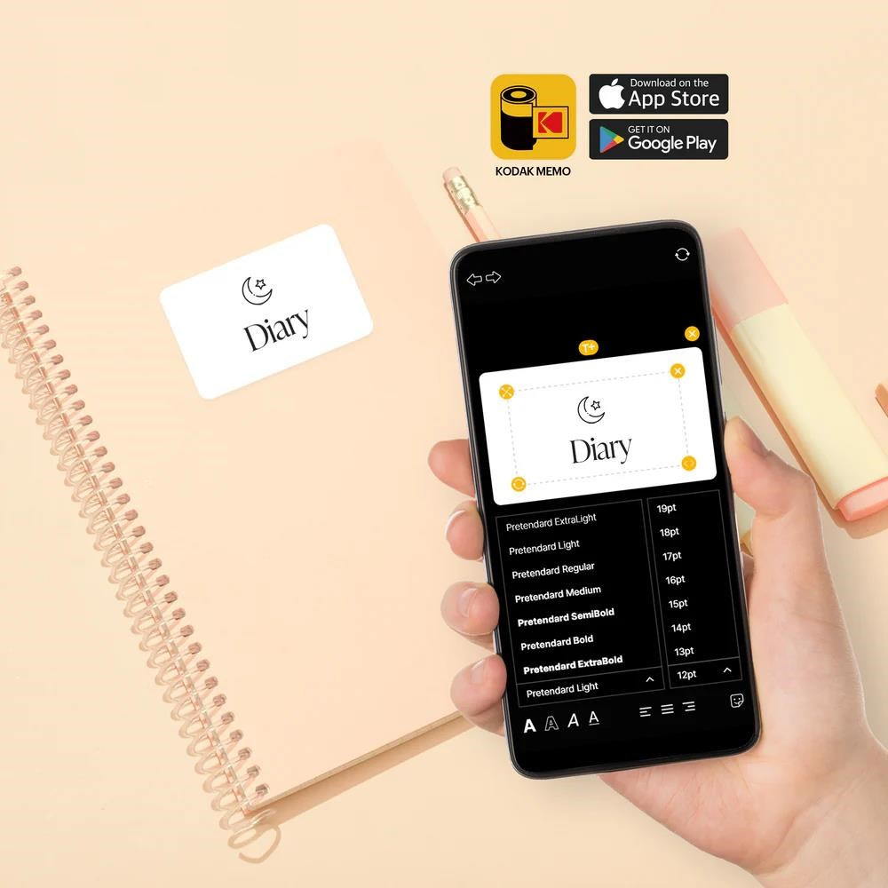 Fotoaparát s tiskem etiket inspirovaný ikonickým designem filmových kazet Kodak. Pořiďte snímky a okamžitě je vytiskněte, nebo připojte telefon a tiskněte obrázky z galerie na etiketový papír o velikosti 2,7 × 1,8" prostřednictvím aplikace KODAK MEMO.