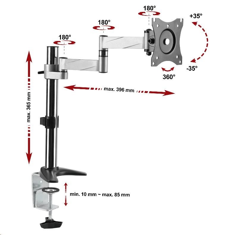 Technické údaje: nosnost 8kg plně nastavelný - 3D polohování monitoru na monitory s úhlopříčkou 13" až 27" podpora VESA 75x75 a 100x100 otáčení do stran +/- 180° náklon +/- 35° rotace obrazovky +/- 180° - funkce PIVOT nastavení vzdálenosti od nosníku 0mm až 396mm nastavení výšky max. 364mm uchycení na stolové desky o průměru 10mm až 85mm dva typy uchycení na stolové desky - svěrák na okraj stolu nebo skrz desku kamkoliv do prostoru krásný vzhled - chromový nosník, ramena ve stříbrném provedení materiál hliník vynikající kvalita, spolehlivost a dlouhá životnost instalační materiál součástí balení záruka 3 roky.