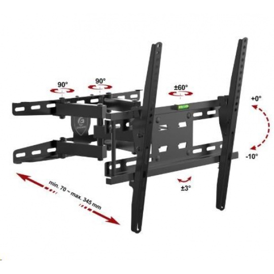 Technické údaje: nosnost 35kg vhodný pro zavěšení LED, OLED, QLED, LCD televizí s úhlopříčkou 26" až 55" podporuje VESA standardy (VESA normy) 200x100 až 400x400 nastavitelná vzdálenost od zdi v rozmezí 70 až 345 mm otáčení do stran +/- 60° náklon 0° až -10° korekce roviny +/- 3° integrovaná vodováha, instalační materiál spolehlivá, bezpečná ocelová konstrukce barevné provedení černé záruka 3 roky Držák LED, OLED, QLED a LCD televize Ergosolid REDOX-K35 podporuje tyto VESA standardy pro uchycení Tv: VESA 200x100 VESA 200x200 VESA 300x200 a 200x300 VESA 300x300 VESA 400x100 VESA 400x200 a 200x400 VESA 400x300 a 300x400 VESA 400x400 Závěsný systém - držák Ergosolid REDOX-K35 je vhodný pro zavěšení všech typů a velkostí televizorů, které mají hmotnost do 35kg a které podporují kterýkoliv z výše uvedených VESA standardů. Uváděné velikosti a typy televizorů jsou pouze orientační - držák je možné použít i na větší televize..