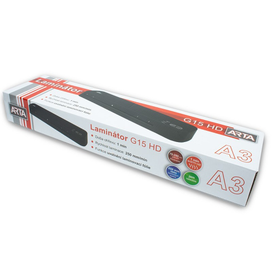 Laminátor dokumentů s možností volby tloušťky laminované fólie. Model ARTA G15 HD A3 umožňuje laminování dokumentů, které mají maximální šířku 330 mm (A3), s fóliemi o tloušťce 75 až 250 mikronů. Doba potřebná k ohřátí je pouze 60 sekund. Je snadno použitelný, kompaktní a vyniká přítomností inteligentní funkce automatického vypnutí po 30 minutách nečinnosti. Součástí je také možnosti uvolnění zaseknutých dokumentů..