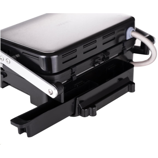 Kontaktní gril na zapékání, který po uvedení do vodorovné polohy přetvoříte na plnohodnotný stolní gril o ploše 1400 cm2.