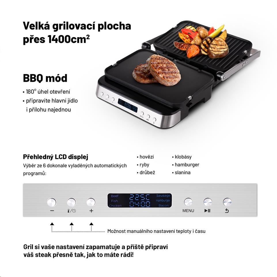 Díky výkonu 2000W si gril bez problému poradí i s prudkým opečením, které je potřeba u kvalitních steaků a disponuje dostatečnou grilovací plochou 1400 cm2. Součástí grilu je praktická miska na odkapávání přebytečného tuku a šťávy. Příjemným bonusem je kvalitní designové provedení vhodné do exteriéru i interiéru.