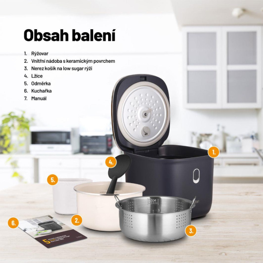Kromě toho, že stiskem jediného tlačítka připravíte dokonale všechny druhy rýže, využijete rýžovar i pro další pokrmy. 6 šikovných přednastavených funkcí - Slow cook, Quick cook, Polévka, Kaše, Low Sugar rýže, Zelenina - si poradí i s přípravou luštěnin či ovesných kaší. Pokud by vám nastavené hodnoty nevyhovovaly, čas i funkci upravíte manuálně. Někdy je potřeba jídlo udržovat teplé, což zvládne funkce Keep Warm. Pro počáteční inspiraci jsme k rýžovaru přibalili kuchařku, která obsahuje 5 zdravých a snadných receptů.