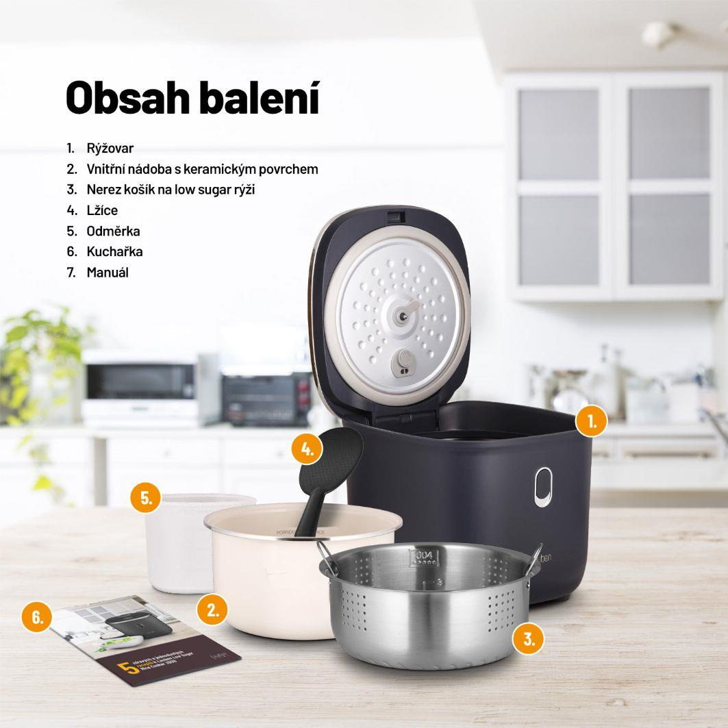 Chcete-li jíst zdravěji, víceučelový rýžovar Lauben Low Sugar Rice Cooker 3000AT vám nesmí chybět. Jeho funkce low sugar zbaví rýži až 40 % sacharidů. Přístroj si poradí se všemi druhy rýže, ale i s dalšími surovinami, například luštěninami. Zvolit můžete ze 6 režimů, které je ale možné ručně upravit. Prémiový nepřilnavý keramický povrch jeho 3l nádoby připraví jídlo pro celou rodinu bez nutnosti použití tuku a obav z připálení. Potěší funkcí Keep Warm, která udrží pokrmy teplé bez nebezpečí rozvaření, odložený start či ochrana proti přetečení a technologie Cool Touch, jejíž zásluhou se o rýžovar nepopálíte. Dotyková tlačítka usnadňují nastavení rýžovaru. Snadná údržba je samozřejmostí, stačí dát vnitřní části do myčky. Pro inspiraci jsme přibalili také kuchařku.