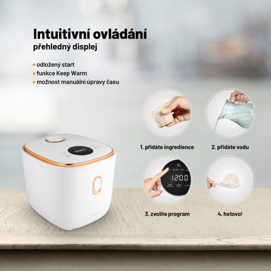 Vařte s lehkostí, chutně a stylověEfektivita, snadné použití a design mají společného jmenovatele, je jím víceúčelový rýžovar Lauben Multifunction Rice Cooker 1200WR Rose Gold Edition. Stiskem jediného tlačítka uvaří všechny druhy rýže na správnou tvrdost a 6 přednastavených funkcí vykouzlí další pokrmy jako kaše nebo polévky. Čas některých programů si však na intuitivním dotykovém displeji můžete nastavit i manuálně. Díky funkci odloženého startu lze mít jídlo připraveno už po návratu domů, opozdilci zase ocení funkci Keep Warm, která udrží pokrm teplý bez rozvaření. Porce nasytí jednotlivce i páry, jež pak mají více času pro sebe, protože ani údržba nezabere čas. Vnitřní hrnec lze dát do myčky. Bezpečné používání zajišťuje ochrana proti přetečení a technologie Cool Touch proti popálení. Rýžovar bude ozdobou každé kuchyně, kterou rozzáří trendy rose gold barvou, a přitom nezabere takřka žádné místo.