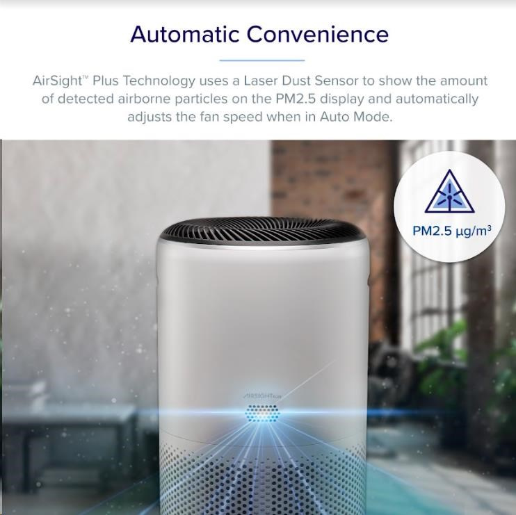 Technologie AirSightTM PLUS je postavená na skenovaní kvality vzduchu speciálním prachovým laserovým senzorem. Ten je schopen zaznamenat znečištění částicemi až 3x menšími než běžně používané infračervené senzory.