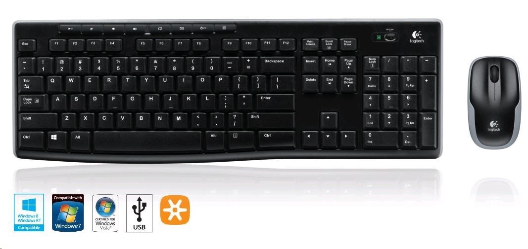 Sada Logitech® Wireless Combo MK270. Spolehlivá bezdrátová sada s miniaturním nanopřijímačem Logitech Unifying®. Systém bezdrátového propojení Logitech Advanced 2,4 GHz představuje kombinaci spolehlivosti kabelového propojení s volností pohybu bezdrátového spojení do vzdálenosti až 10 metrů, prakticky bez