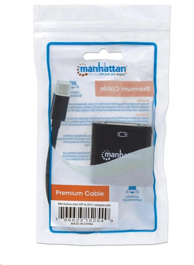 Manhattan Active Mini DisplayPort to DVI-I Adapters establish a fast and convenient connection between a media source equipped with a Mini DisplayPort and a DVI display cable. This active adapter overcomes the non-DP++ (dual-mode) video/graphics card's limitations and converts the signal to display. It is ideal for multi-screen gaming, digital signage in retail displays, financial market and other applications. Nickel-plated contacts and full shielding help Manhattan Active Mini DisplayPort to DVI Adapters provide clear and stable video transmissions in UHD, home and office multimedia applications. Durable PVC jackets and molded boots with strain relief help ensure connections remain uninterrupted and steady.
