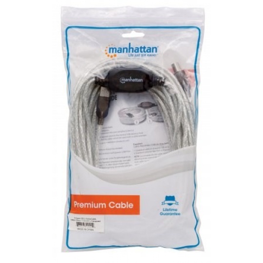 Use the MANHATTAN Hi-Speed USB Active Cable to connect a computer USB port to a USB printer or other B-male device almost anywhere in the room. This single, nondaisy-chainable cable extension provides a convenient, uninterrupted 11 m (36 ft.) connection. MANHATTAN Hi-Speed USB Active Cable with built-it repeater is fully-compliant with USB 1.1 and Hi-Speed USB specifications to help devices operate at maximum performance. Plug and Play capability, Windows7/8/Macintosh versatility and no external power or driver requirements help provide greater flexibility in computer and peripheral placement and office layout.