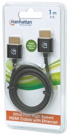 HDMI has become the standard digital connection, delivering the highest-quality audio and video signal over a single cable. With an ultra-thin, tangle-resistant design, gold-plated contacts and a sturdy yet slim PVC jacket, Manhattan Ultra-thin High Speed HDMI Cables are carefully constructed to meet the evolving needs of the ultra high-definition marketplace. Manhattan High Speed HDMI Cables provide the highest resolution possible at 4K x 2K, an audio return channel and a bandwidth of 18 Gbps at 600 MHz. These high-quality cables provide ultra high-definition video and multichannel, digital audio with increased performance characteristics and greater accuracy. Expanded features include Internet connectivity for home entertainment devices using a single HDMI connection. Plus, this cable's unique design makes it easy to handle and shape without worrying about snags and tangles.