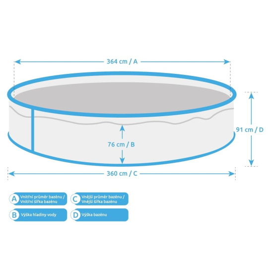 Uvedené rozměry bazénu jsou pouze orientační a ovlivnit je může rovnost podkladu či objem napuštěné vody. Povolená výrobní odchylka je 5 %.