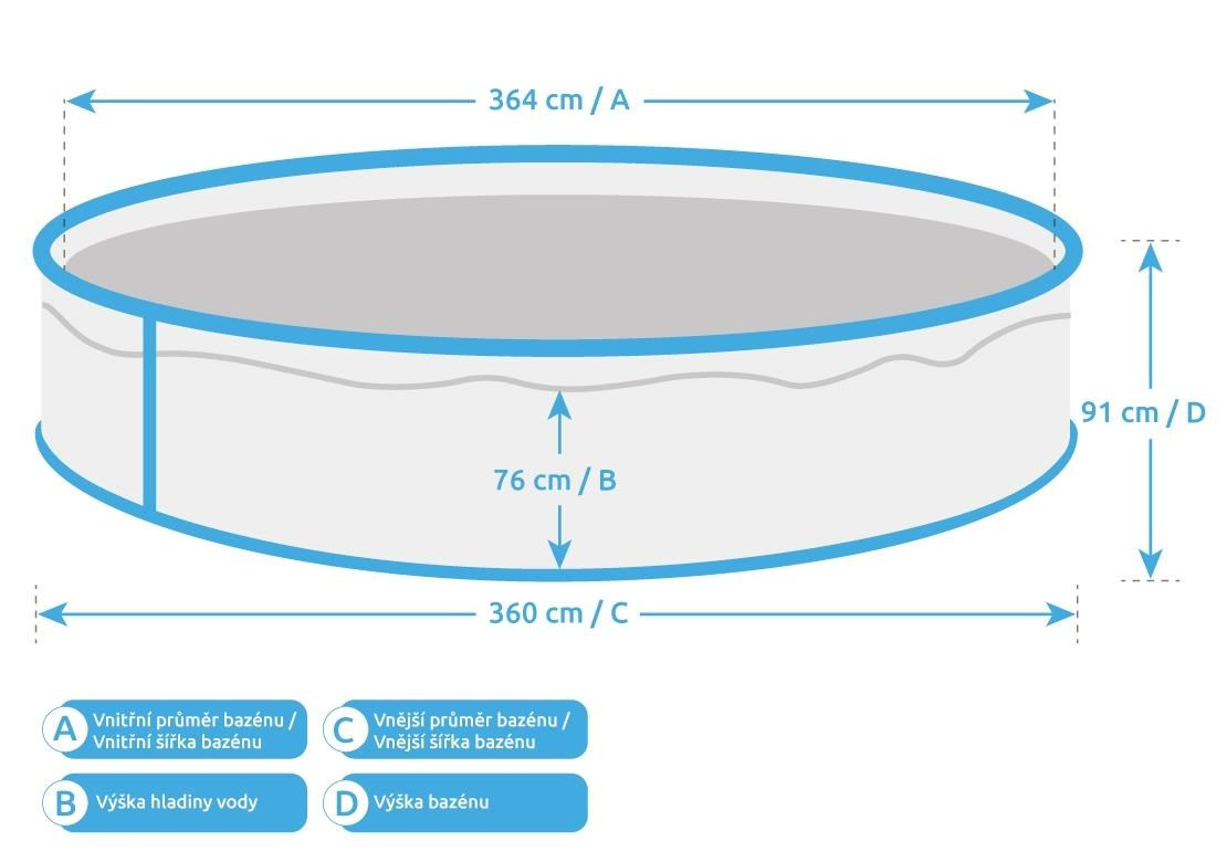 Uvedené rozměry bazénu jsou pouze orientační a ovlivnit je může rovnost podkladu či objem napuštěné vody. Povolená výrobní odchylka je 5 %.