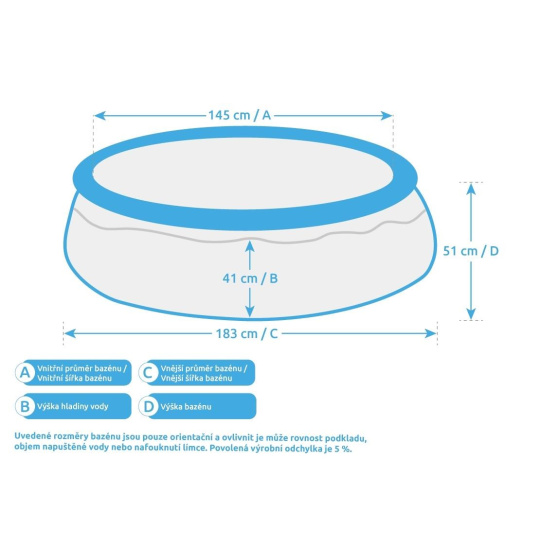 Uvedené rozměry bazénu jsou pouze orientační a ovlivnit je může rovnost podkladu, objem napuštěné vody nebo nafouknutí límce. Povolená výrobní odchylka je 5 %.