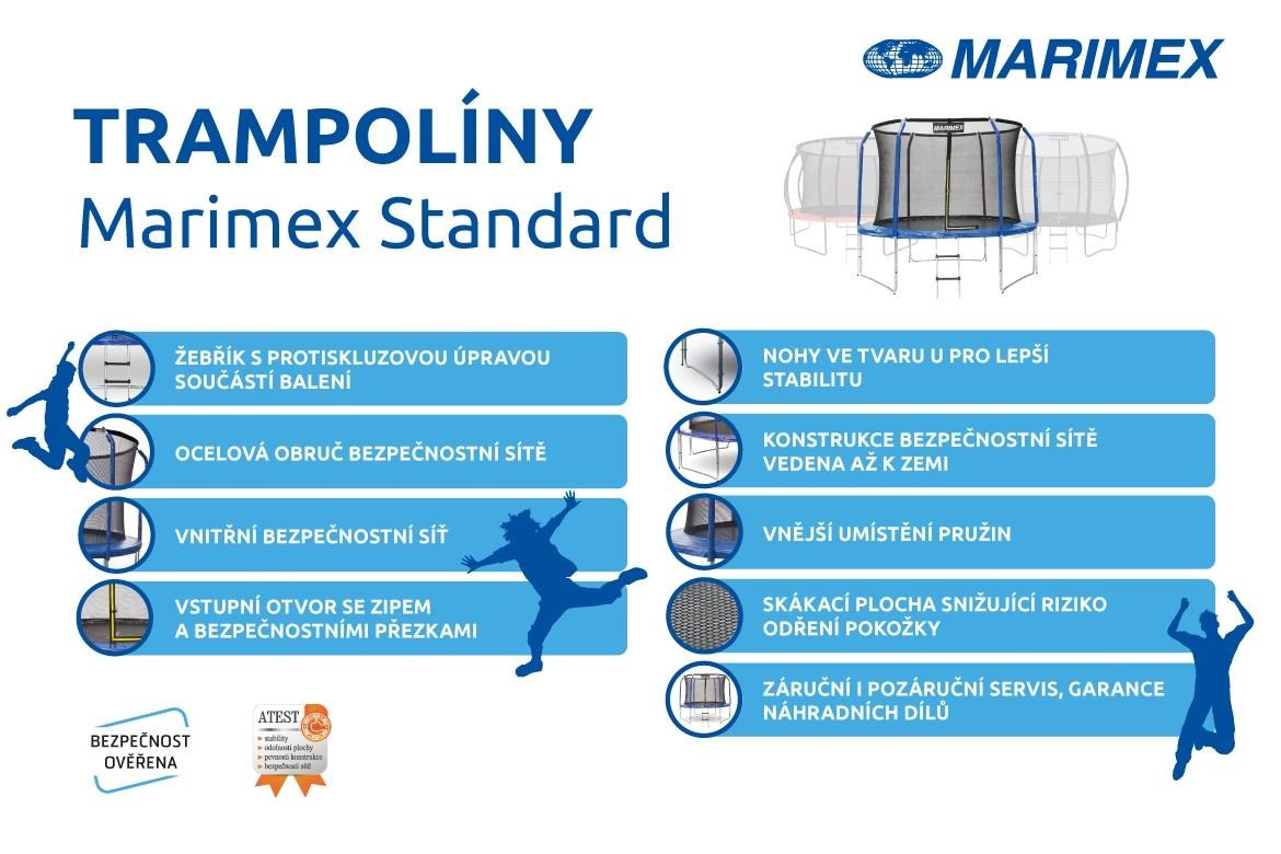 Trampolína Marimex Standard je skvělým doplňkem každé zahrady. Děti skákání na trampolíně milují a při skákání si snadno zacvičí i dospělí - nosnost je až 150 kg. Dokonalou stabilitu zajišťují tři nohy ve tvaru písmene U.