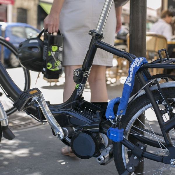 Zpevněný ocelový řetěz s ocelovým visacím zámkem je 90 cm dlouhý a obsahuje ocelové spojky o průměru 6 mm, které odolávají řezání. Nylonový kryt řetězu zabraňuje poškrábání. Visací ocelový zámek o průměru 40 mm je odolný proti povětrnostním vlivům. Plastový kryt na visacím zámku zabraňuje poškrábání. Třmen s průměrem 9 mm je vyroben z oceli pro odolnost proti řezání. Obsahuje 4-kolíkový válec zabraňující vyhmatání a dvojitou západku odolnou proti vypáčení.