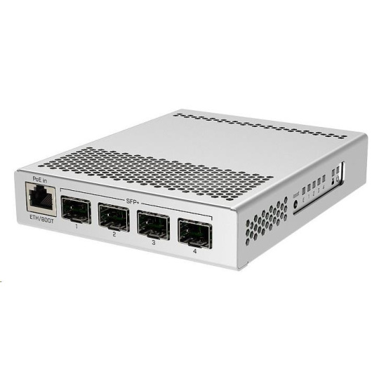 CRS305-1G-4S+IN je kompaktní, přesto velmi výkonný switch, který má čtyři SFP+ porty s rychlostí 10 Gbps/port. Zařízení má také kromě optických portů i jeden Gigabitový ethernet s podporou POE IN pro snadný přístup k zařízení, konfiguraci zařízení nebo jako převod na metalické vedení. K napájení slouží hned dva DC konektory pro redundanci napájení. Switch je velmi elegantní, kompaktní a jeho kovové pouzdro bez ventilátorů zajišťuje tichý provoz.