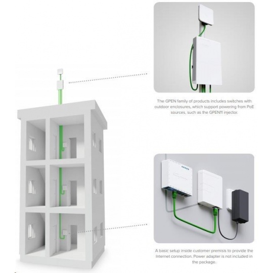 GPEN11 je POE injektor s dvěma gigabitovými ethernet porty určený k montáži na zeď, pomocí kterého můžete napájet zařízení určené pro příjem nebo distribuci konektivity v místě instalace. Výstupní napětí je stejné jako vstupní, v rozmezí 12-57V.