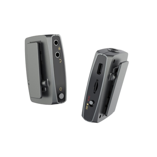 Bezdrátové mikrofonní vysílače v tomto setu mají vestavěné všesměrové mikrofony. V případě potřeby však mohou sloužit také jako záznamové zařízení. Stačí vložit microSD kartu a jednoduchým přepnutím tlačítka začít během pár vteřin nahrávat. Tím odpadá potřeba mít s sebou další zařízení pro audio záznam a vystačíte si jen s vysílačem/rekordérem, který se bez problémů vejde do kapsy. Naprosto ideální řešení při cestování nalehko. Záznam na microSD je v nekomprimovaném formátu WAV s přenosovou rychlostí 177 kbps, takže budete mít k dispozici velmi kvalitní záznam pro následnou postprodukci.